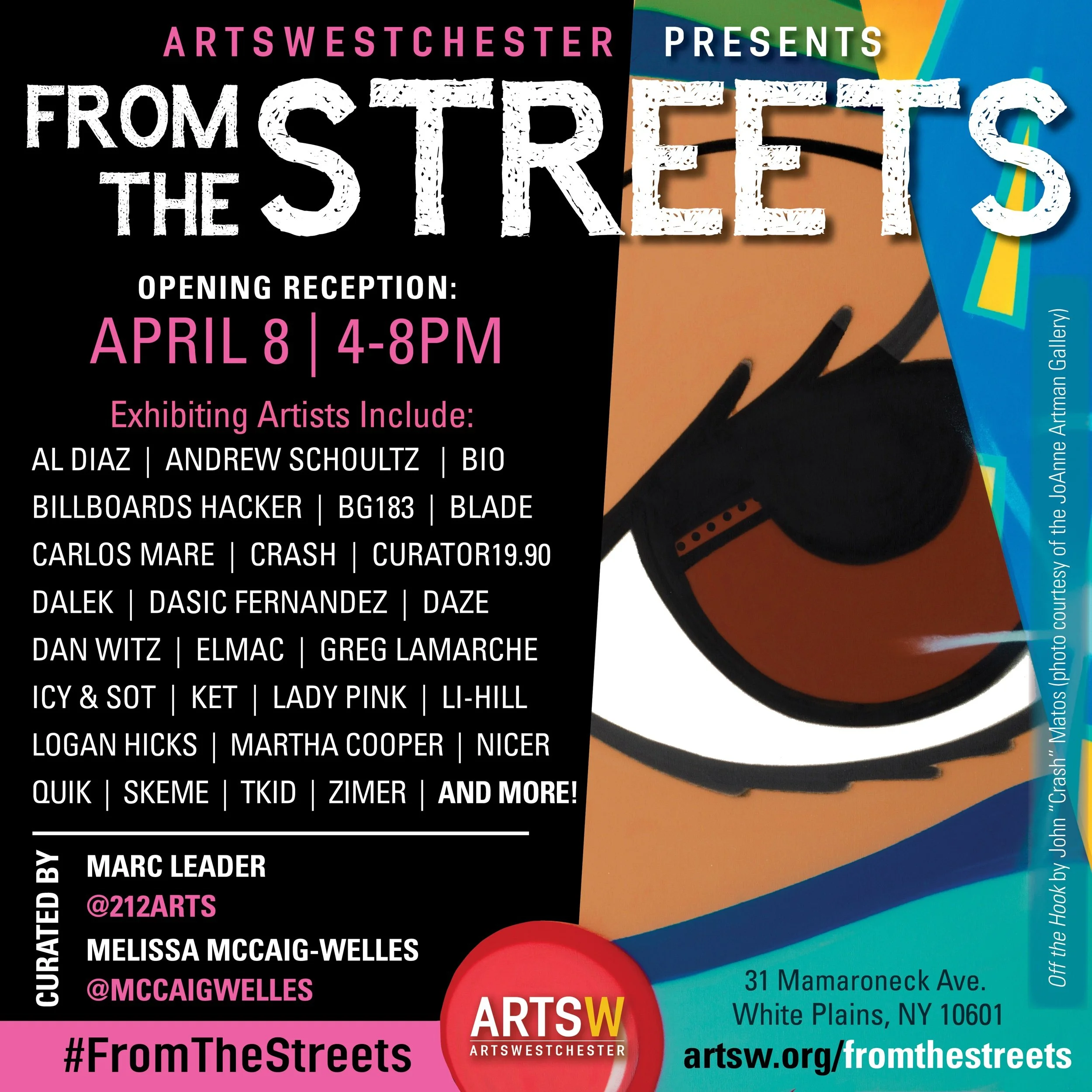 Co-curated by Melissa McCaig-Welles of Curator 19.90 and Marc Leader of 212 ARTS, From the Streets celebrated the evolution of graffiti and urban art from public walls to institutional recognition. The exhibition featured large-scale murals, photography, sculpture, and installations by more than 25 internationally recognized street artists, capturing the energy and diversity of a global movement. By bringing street art into the gallery space, From the Streets invited new audiences to engage with the form as both contemporary art and cultural history.